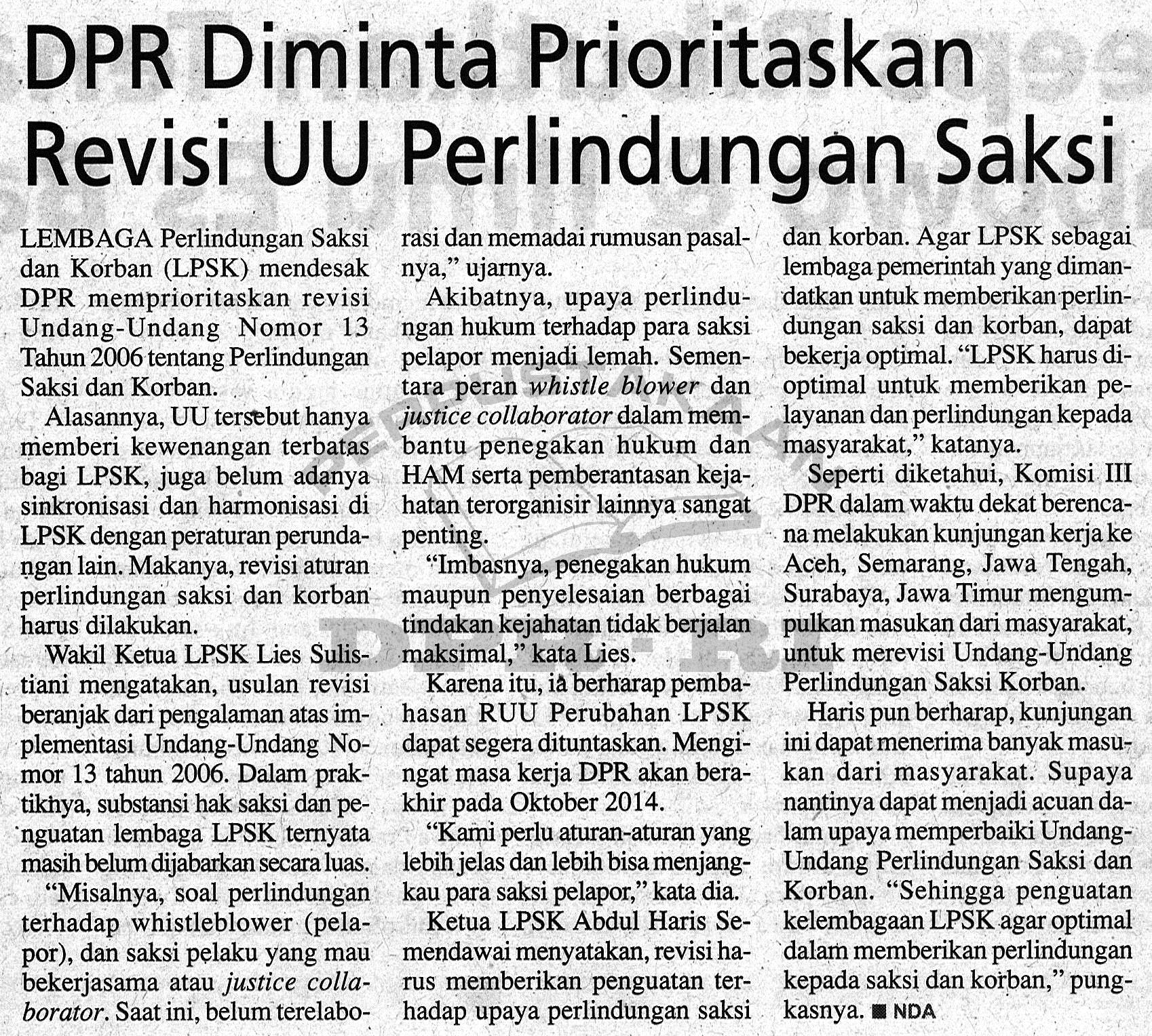 | Judul | DPR Diminta Prioritaskan Revisi UU Perlindungan Saksi |