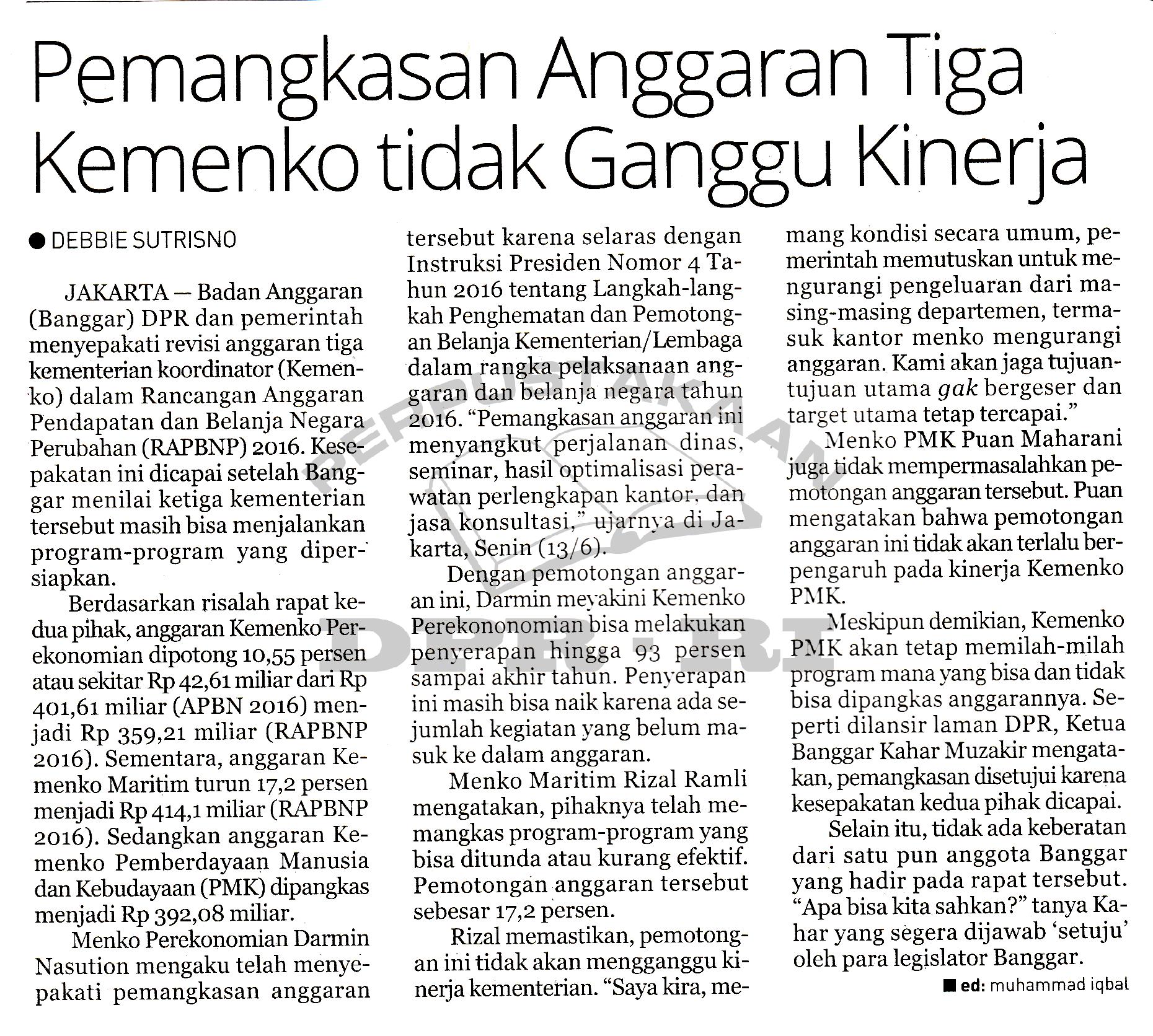 | Kata Kunci | Pemangkasan Anggaran, Kemenko, Banggar, RAPBNP 2016 |