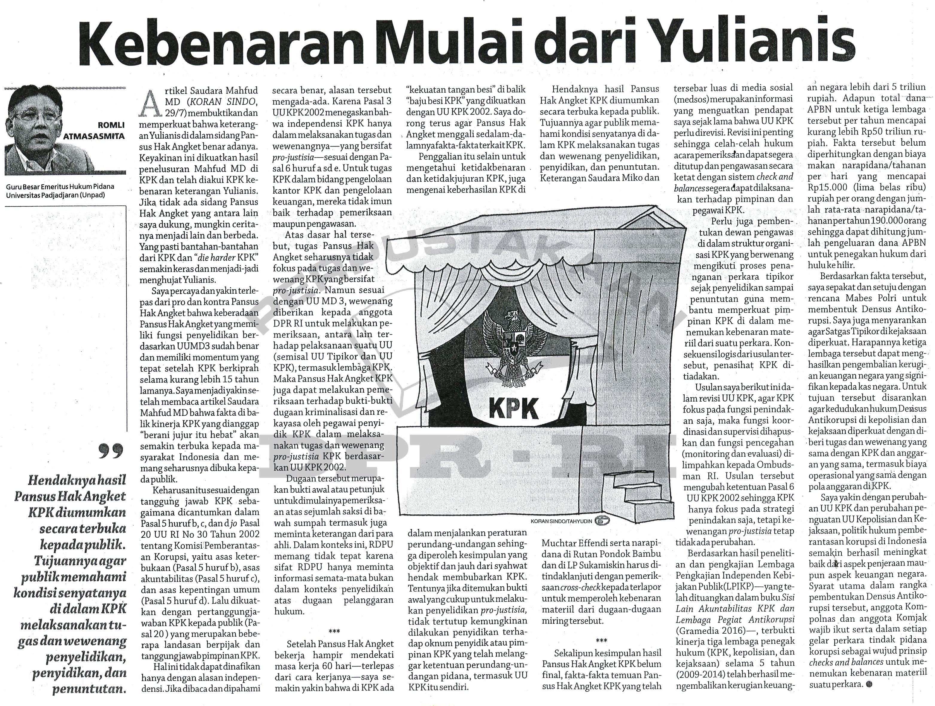 | Kata Kunci | Yulianis, Hak Angket, Mahfud MD, KPK, pro kontra, pansus Hak Angket KPK, UUMD3, tugas, wewenang, independensi, UU Tipikor, UU KPK, pelanggaran hukum, UU kepolisian dan kejaksaan, publik, |