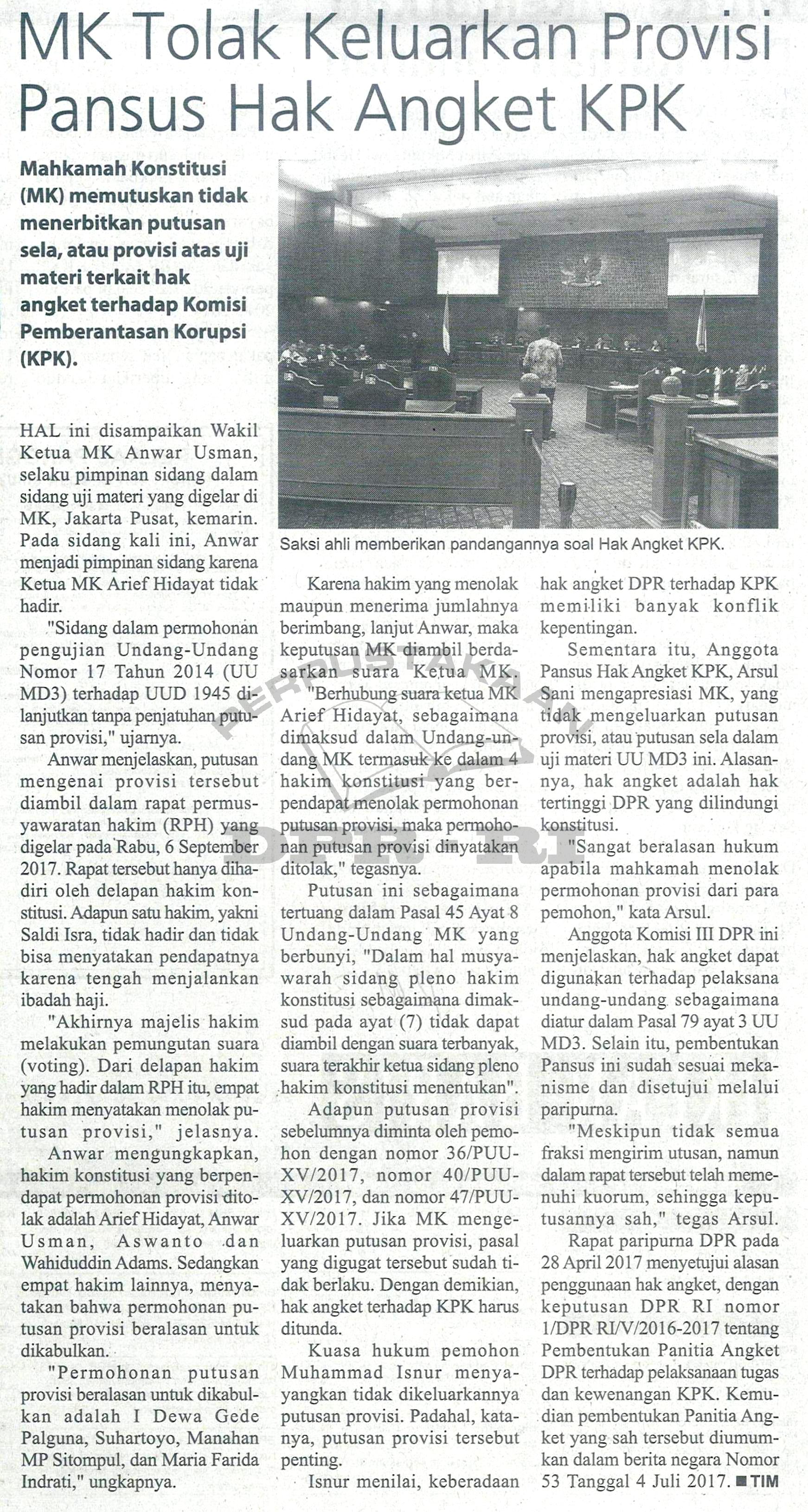 | Judul | MK Tolak Keluarkan Provisi Pansus Hak Angket KPK |