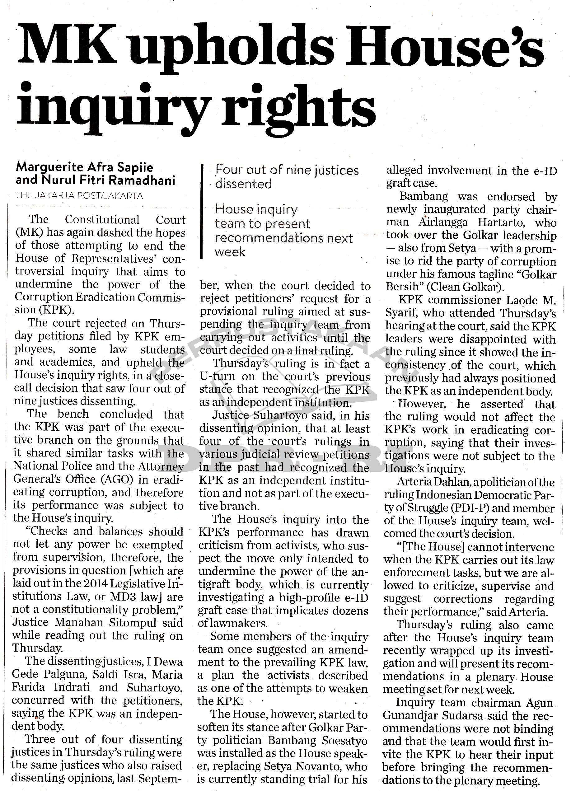 | Kata Kunci | kpk, komisi pemberantasan korupsi, hak angket, i dewa gede palguna, saldi isra, maria farida indrati, suhartoyo, bambang soesatyo |
