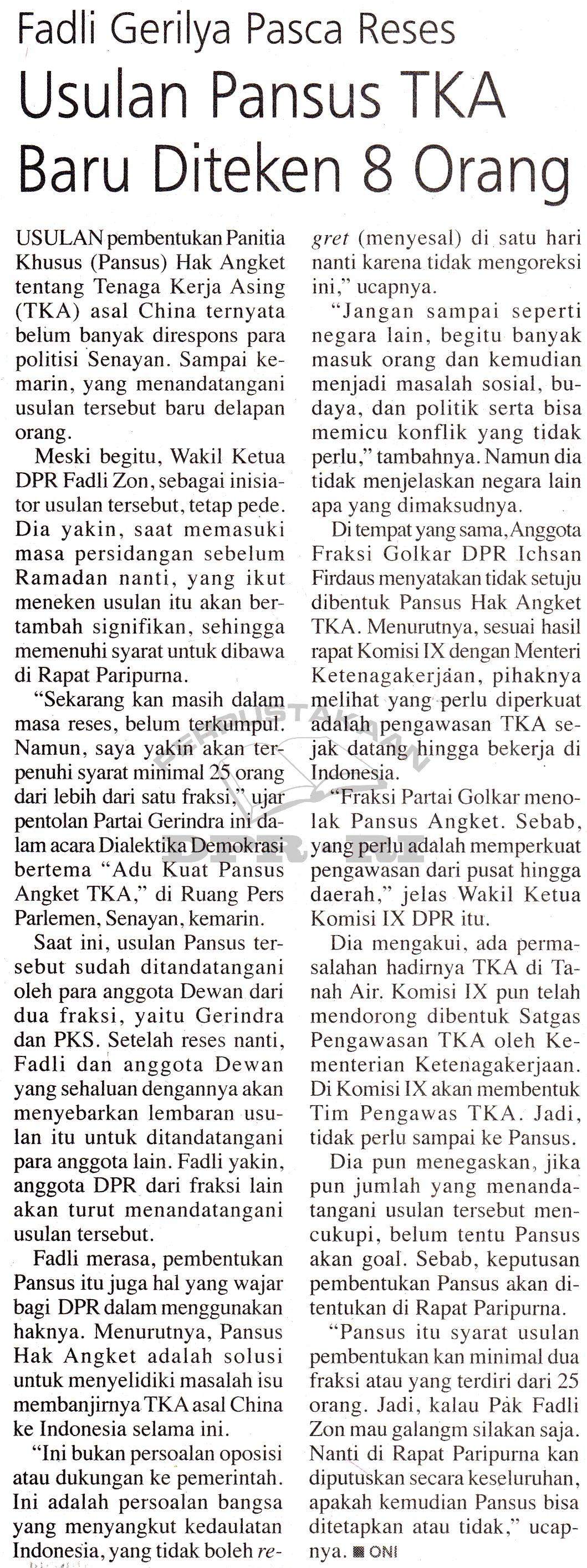 | Judul | Fadli Gerilya Pasca Reses - Usulan Pansus TKA Baru Diteken 8 Orang |