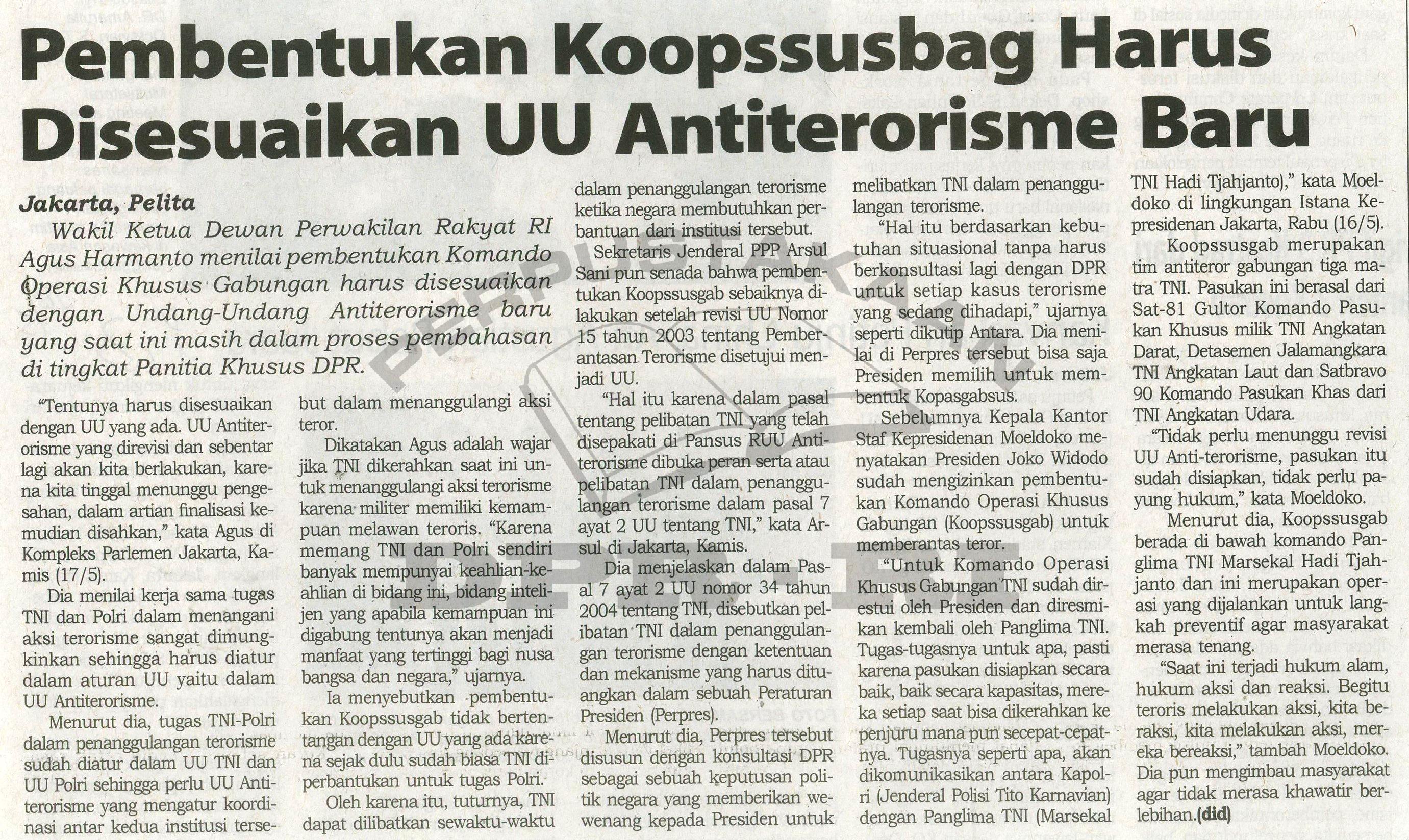 | Judul | Pembentukan Koopssusbag Harus Disesuaikan UU Antiterorisme Baru |