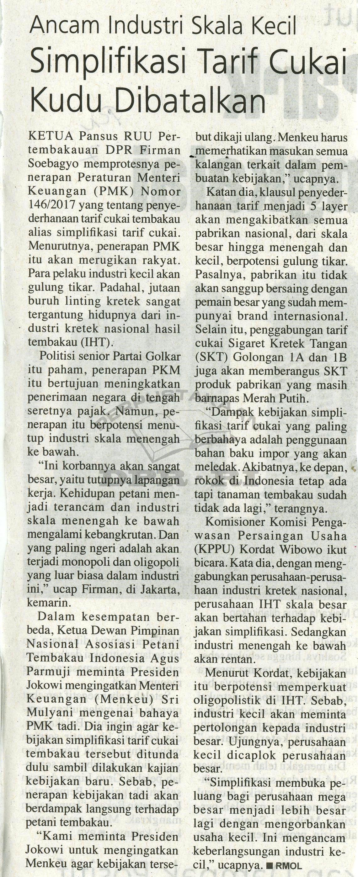 | Kata Kunci | Ketua Pansus RUU Pertembakauan, Firman Soebagyo, simplifikasi tarif cukai, industri kretek nasional hasil tembakau (IHT), Peraturan Menteri Keuangan Nomor 146/2017, Ketua Dewan Pimpinan Nasional Asosiasi Petani Tembakau Indonesia, Agus Parmuji, Presiden, Jokowi, Menteri Keuangan, Sri Mulyani, Komisioner Komisi Pengawasan Persaingan Usaha (KPPU), |