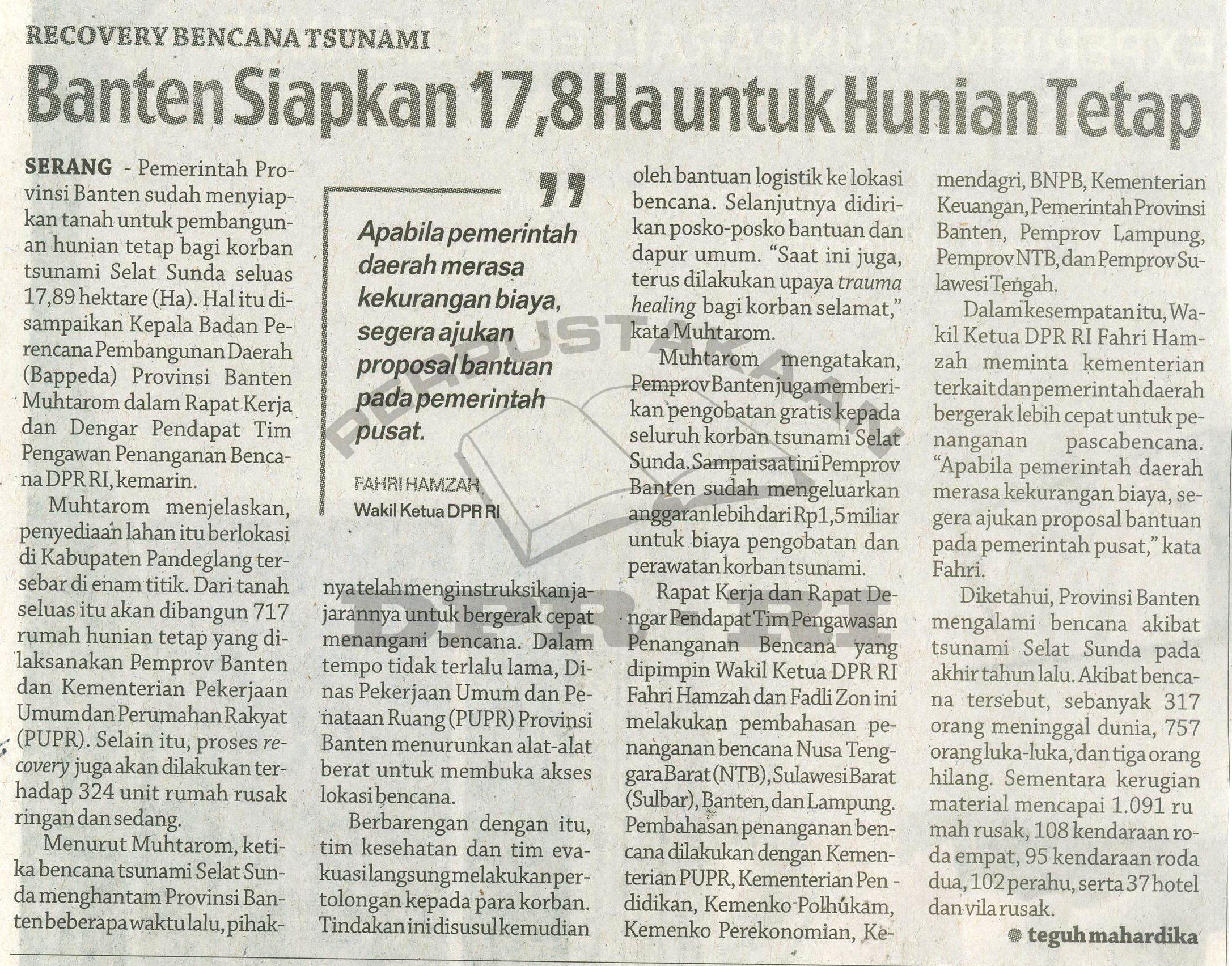 | Judul | Recovery Bencana Tsunami : Banten Siapkan 17,8 Ha untuk Hunian Tetap |