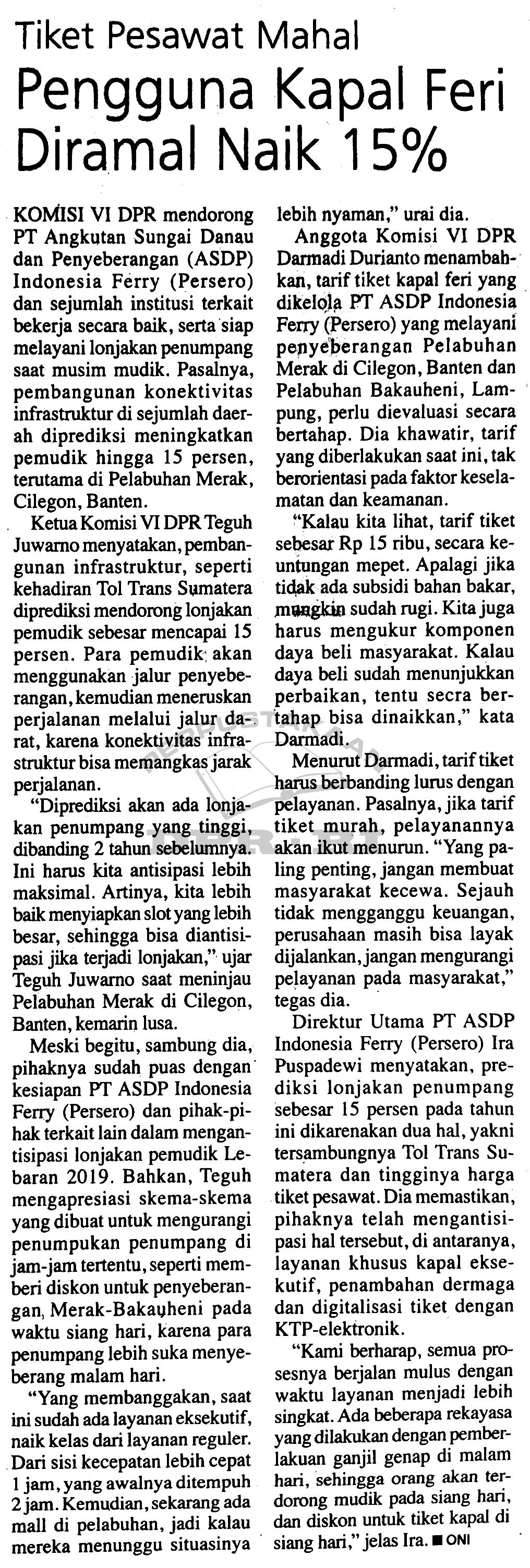 | Kata Kunci | tiket pesawat, kapal feri, Angkutan Sungai Danau dan Penyeberangan (ASDP), Indonesia Ferry (Persero), Direktur Utama PT ASDP Ira Puspadewi, Ketua Komisi VI DPR Teguh Juwarno, Pembangunan Infrastruktur, Tol Trans Sumatera, Pelabuhan Merak Cilegon |