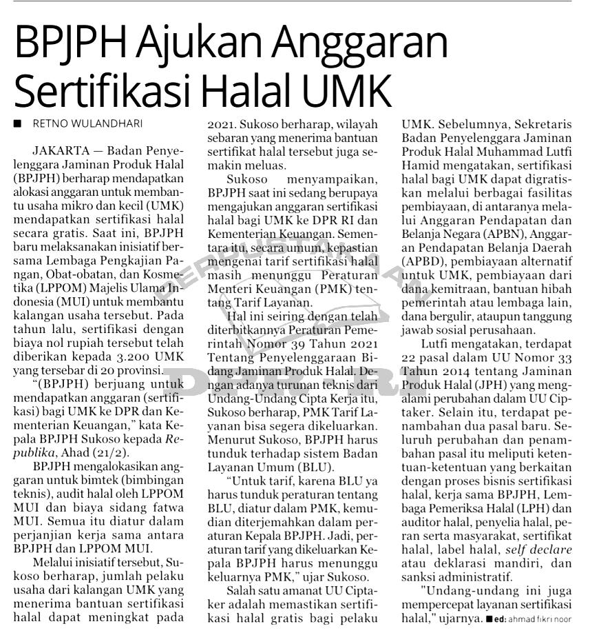 | Judul | BPJPH Ajukan Anggaran Sertifikasi Halal UMK |
