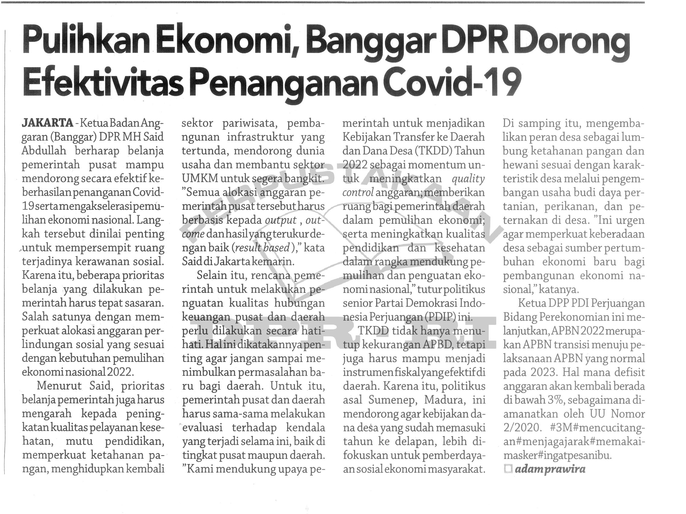| Judul | Pulihkan Ekonomi, Banggar DPR Dorong Efektivitas Penanganan Covid-19 |