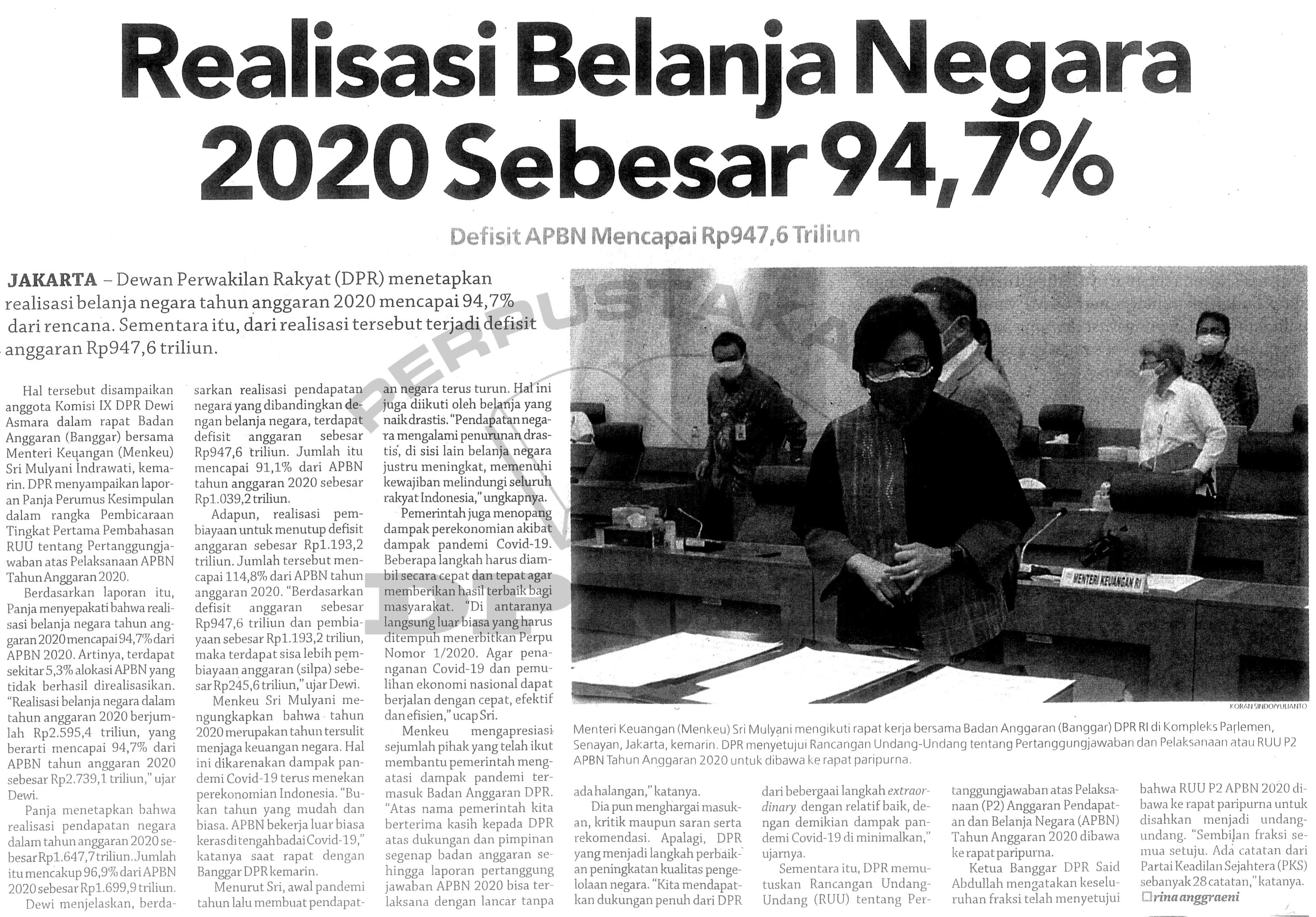 | Judul | Realisasi Belanja Negara 2020 Sebesar 94,7 % : Defisit APBN Mencapai Rp 947,6 Triliun |