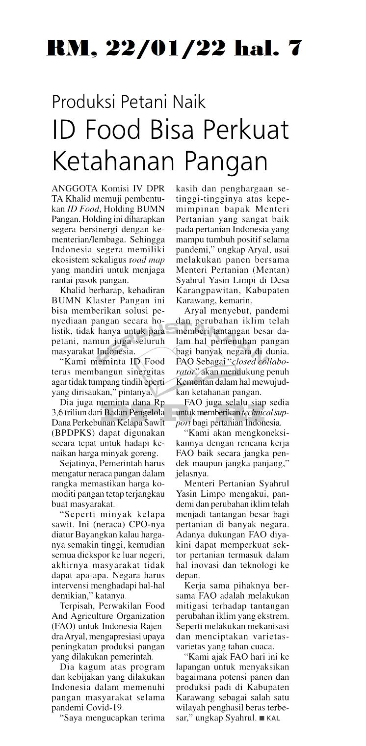 | Kata Kunci | ID Food, petani, ketahanan pangan, Anggota Komisi IV DPR, TA Khalid, holding BUMN, pangan, Badan Pengelola Dana Perkebunan Kelapa Sawit (BPDPKS), panen bersama, Menteri Pertanian, Syahrul Yasin Limpi |