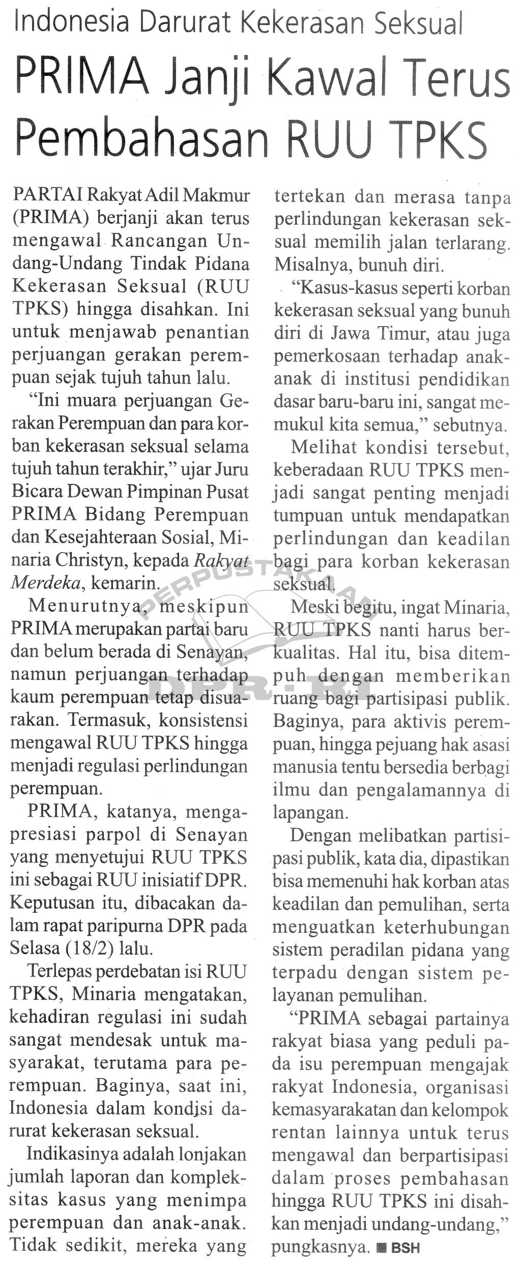 | Judul | Indonesia Darurat Kekerasan Seksual : PRIMA Janji Kawal Terus Pembahasan RUU TPKS |