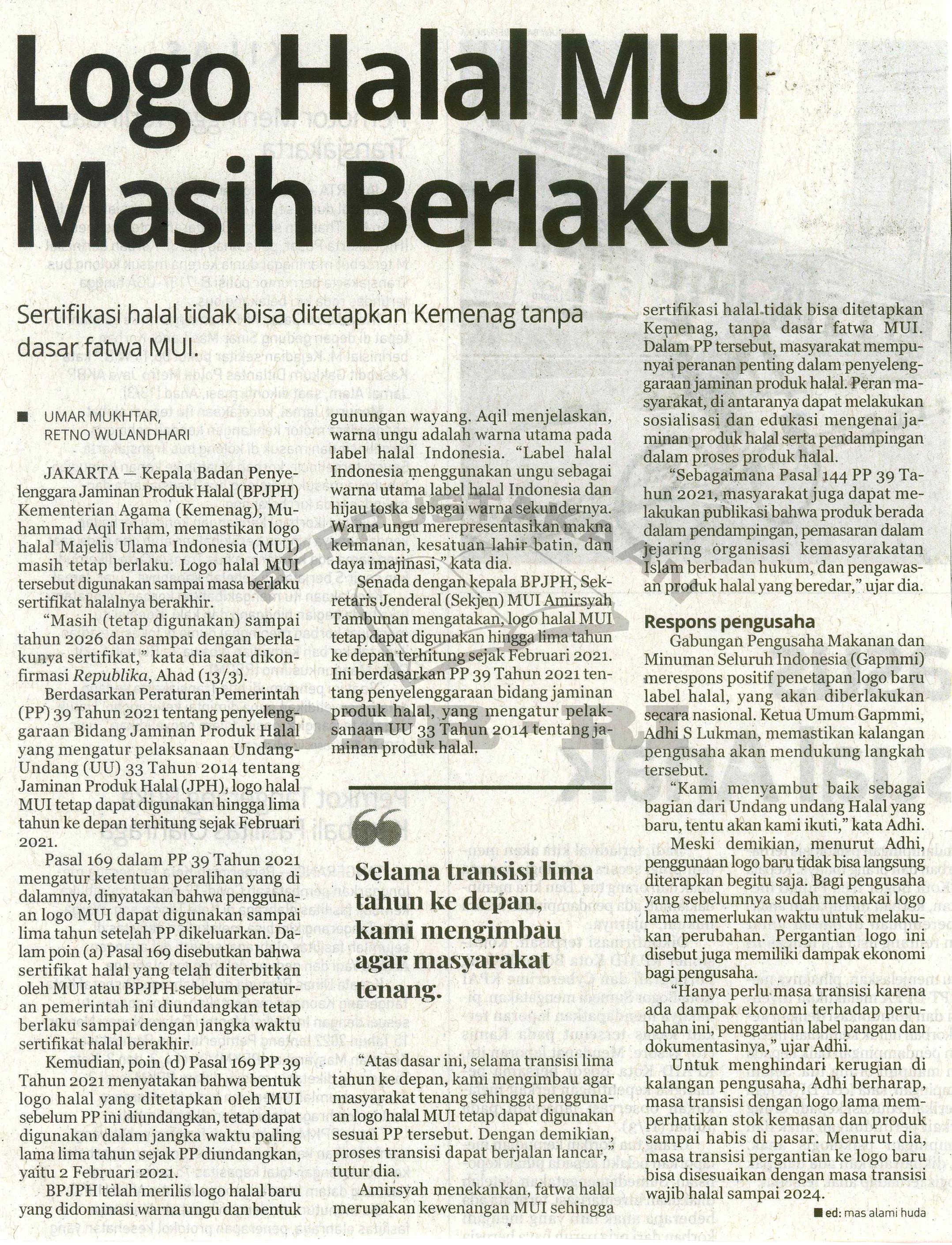 | Kata Kunci | Badan Penyelenggara Jaminan Produk Halal (BPJPH), Kementerian Agama, Muhammad Aqil Irham, Logo Halal, MUI, Undang Undang 33 Tahun 2014 tentang Jaminan Produk Halal, fatwa, Sekretaris Jenderal MUI, Amirsyah Tambunan, Gabungan Pengusaha Makanan dan Minuman Seluruh Indonesia (Gapmmi), Ketua Umum Gapmmi, Adhi S Lukman, pengusaha, |