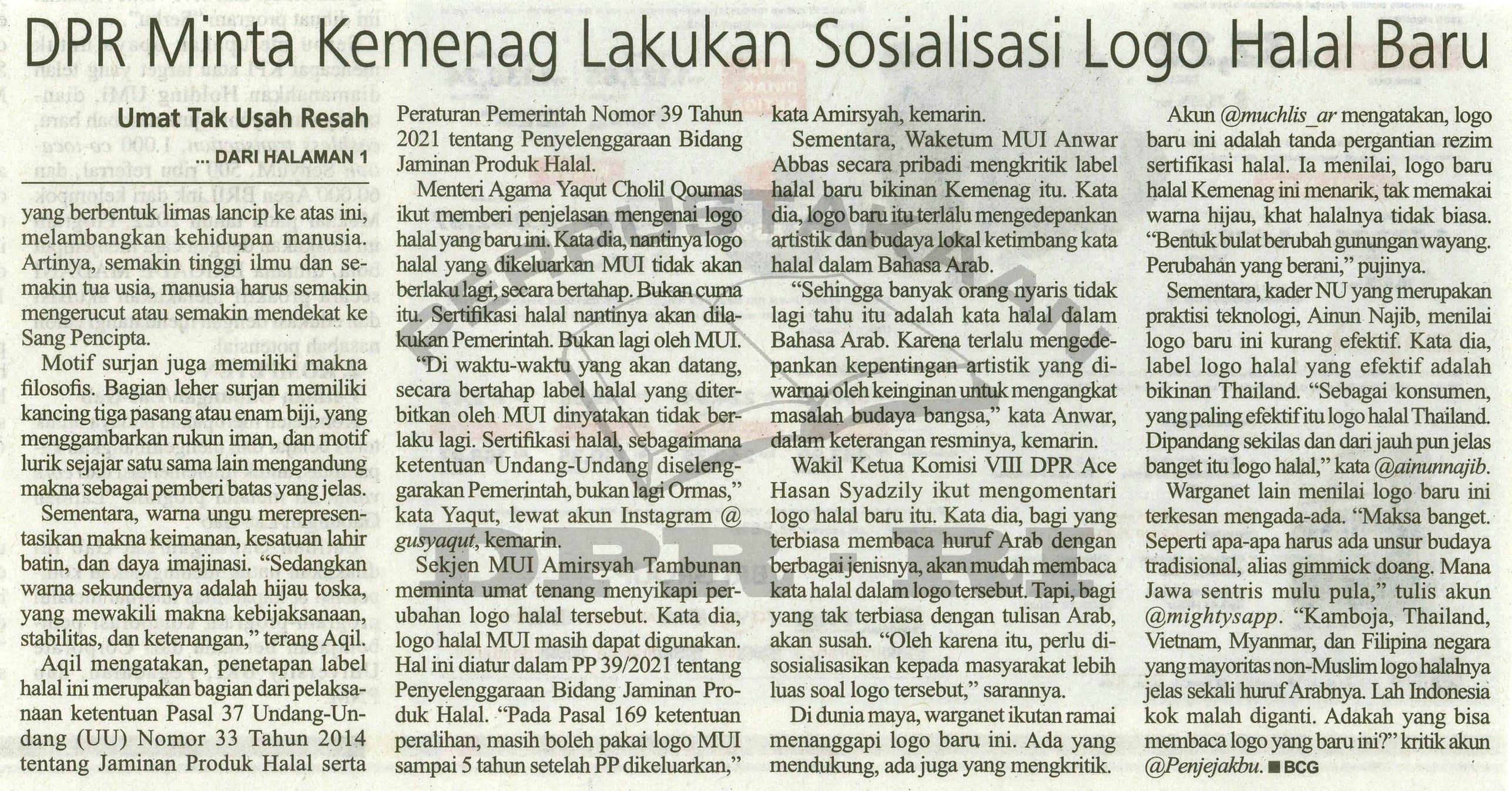 | Kata Kunci | Kementerian Agama, logo halal, Majelis Ulama Indonesia (MUI), gunungan wayang, Badan Penyelenggara Jaminan Produk Halal (BPJPH), Kementerian Agama, Kepala BPJPH, Muhammad Aqil Irham, Menteri Agama, Yaqut Cholil Qoumas, Sekjen MUI, Amirsyah Tambunan, Wakil Ketua Umum MUI, Anwar Abbas, Wakil Ketua Komisi VIII, Ace Hasan Syadzily, Ainun Najib, |