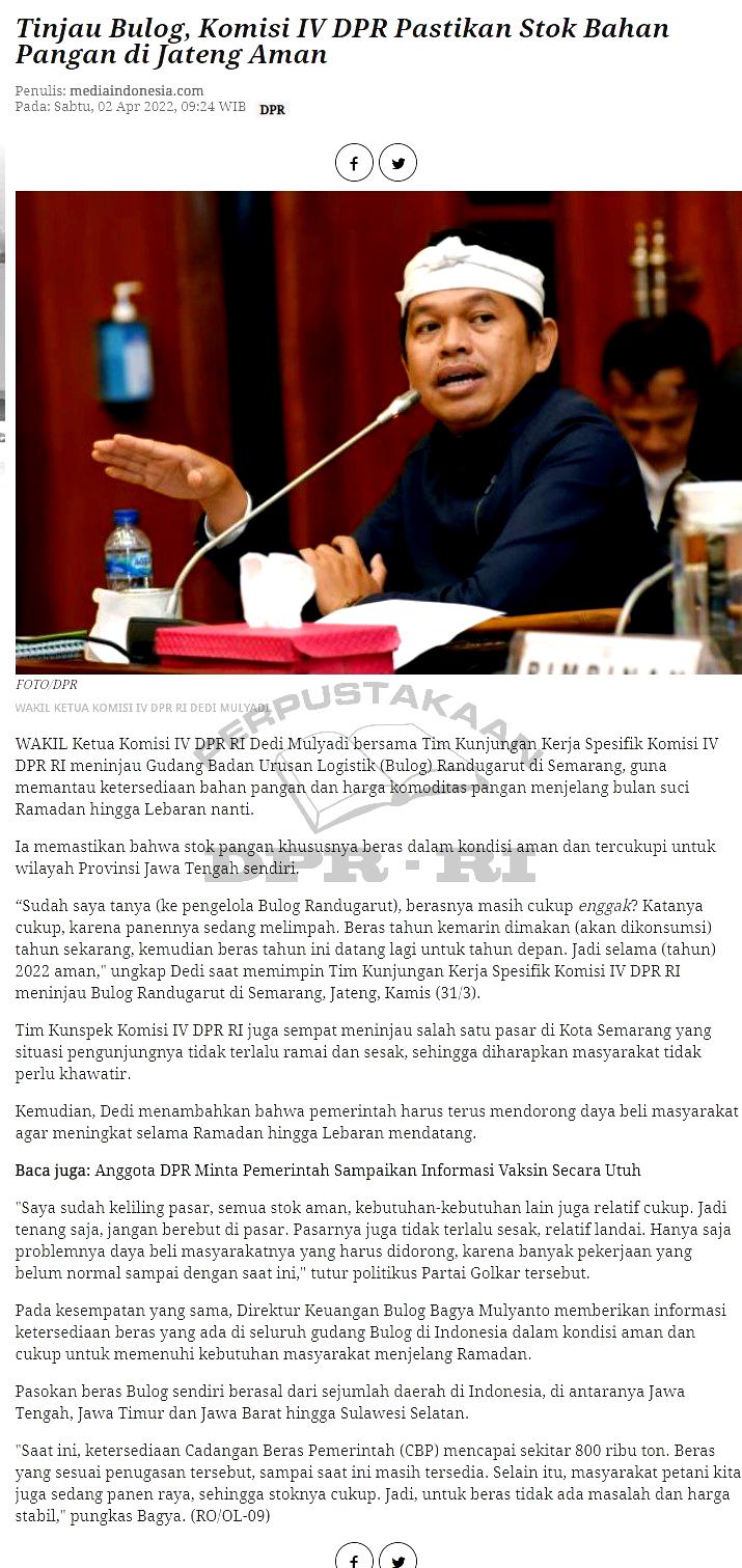 | Judul | Tinjau Bulog, Komisi IV DPR Pastikan Stok Bahan Pangan di Jateng Aman |