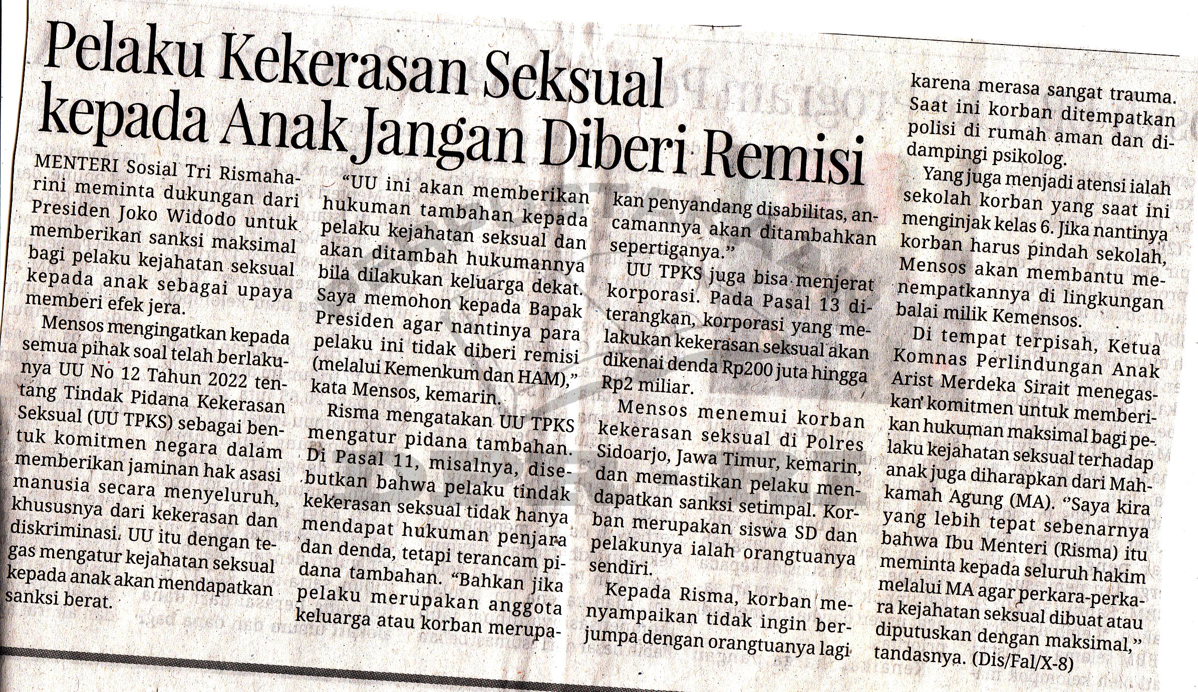 | Judul | Pelaku kekerasan seksual kepada anak jangan diberi remisi |