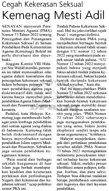 | Kata Kunci | kekerasan seksual, kementrian agama, Hidayat nur Wahid, Peraturan Menteri Agama, UU nomor 12 tahun 2022 |