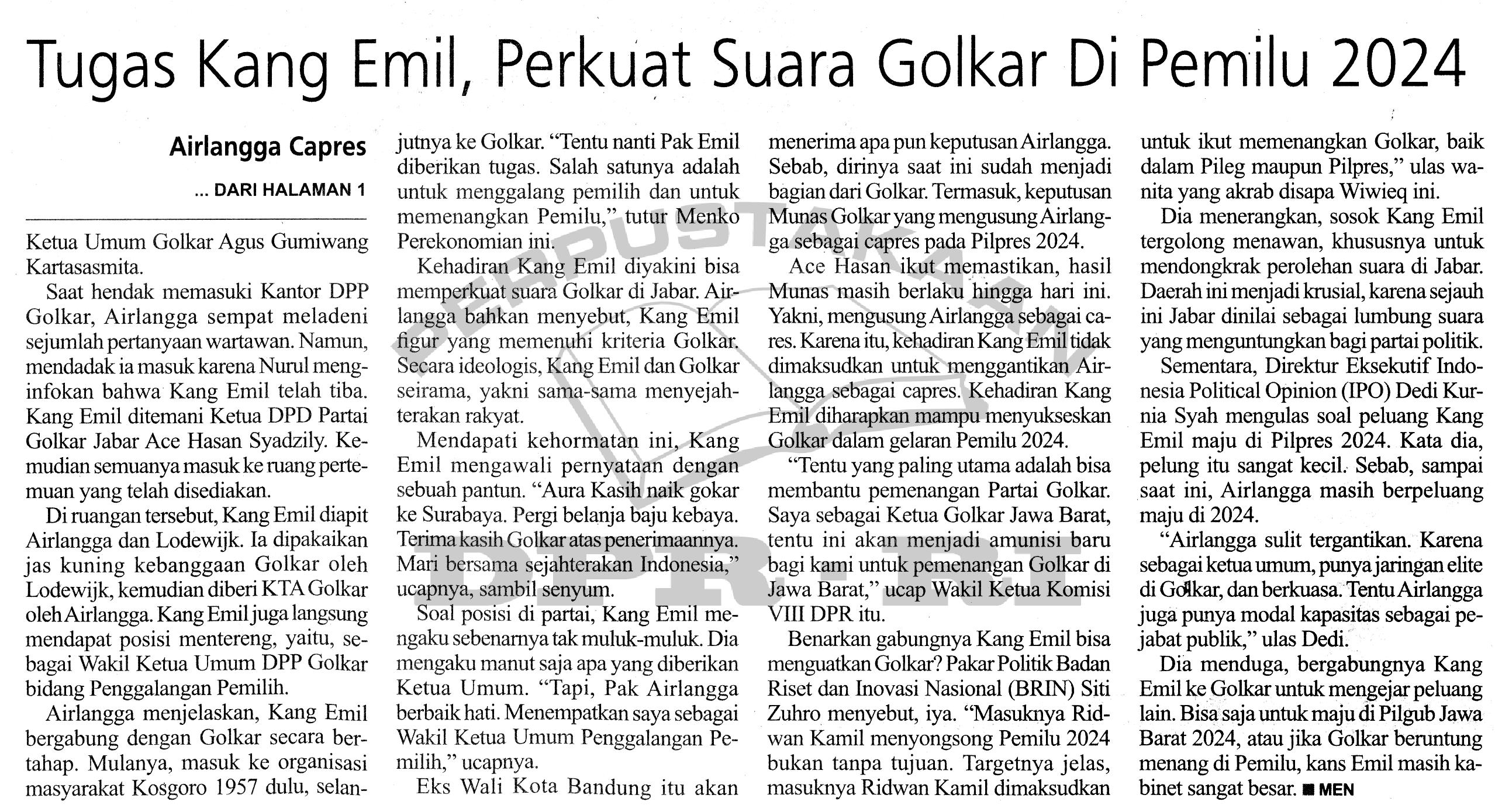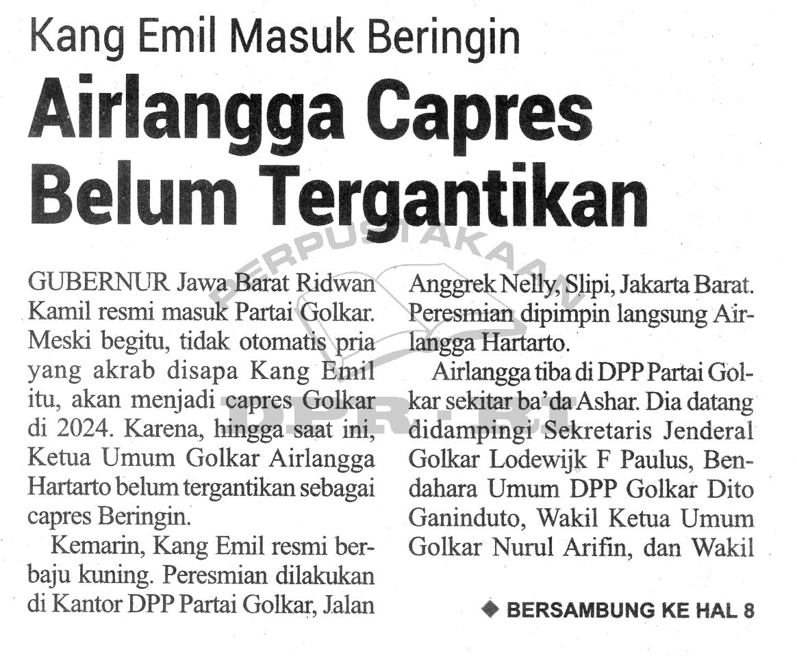 | Kata Kunci | Gubernur Jawa Barat, Ridwan Kamil, Partai Golkar, Ketua Umum Partai Golkar, Airlangga Hartarto, Beringin, DPP Partai Golkar, Wakil Ketua Umum Golkar, Nurul Arifin, Ketua Umum Golkar, Agus Gumiwang Kartasasmita, Ace HAsan Syadzily, Lodewijk, Wakil Ketua Komisi VIII, Direktur Eksekutif Indonesia Political Opinion (IPO), Dedi Kurnia Syah, Pilpres 2024, Kang Emil, |