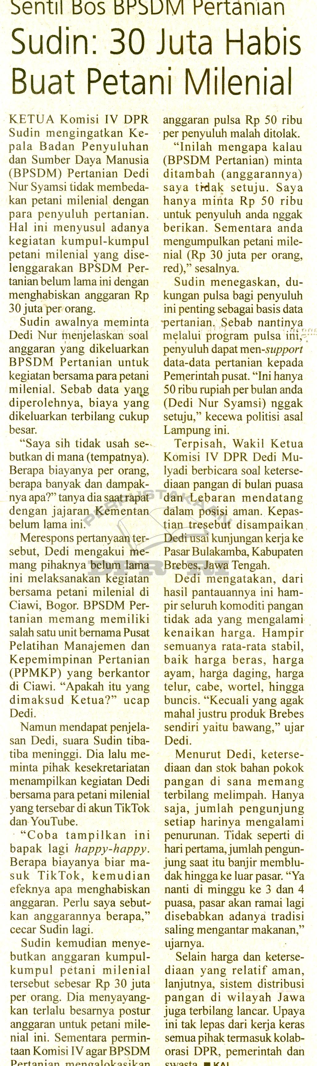 | Judul | Sentil Bos BPSDM Pertanian, Sudin: 30 Juta Habis Buat Petani Milenial |