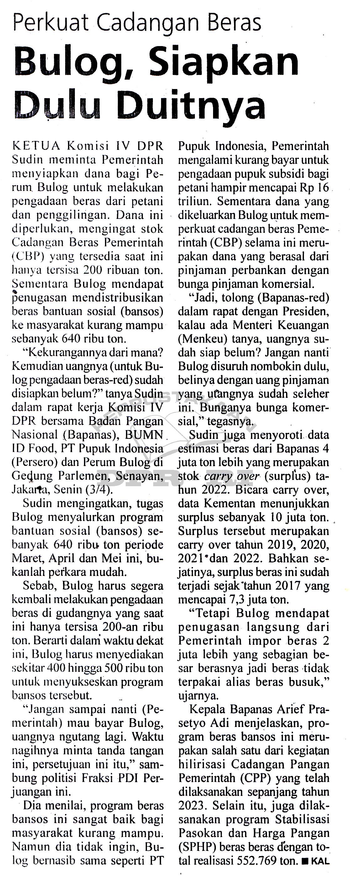 Perkuat Cadangan Beras, Bulog, Komisi IV, Sudin, CBP,