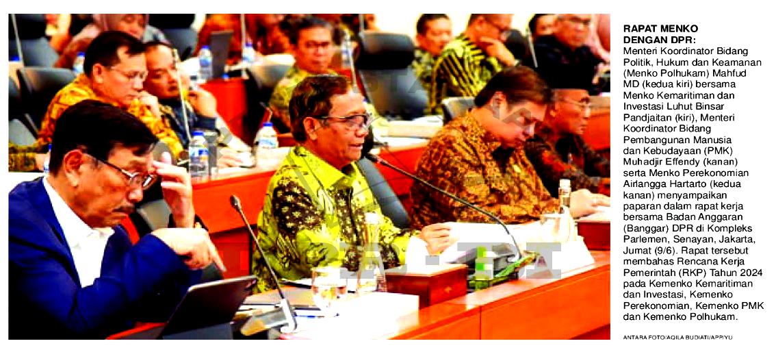 | Kata Kunci | Menkopolhukam, Mahfud MD, Menko Kemaritiman, Luhut Binsar Pandjaitan, Badan Anggaran, Menko PMK, Muhadjir Effendy, Rencana Kerja Pemerintah 2024 |