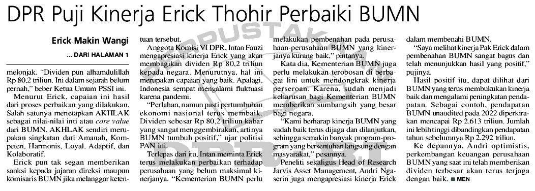 | Kata Kunci | BUMN, Erick Thohir, Dividen, Laba, Nilai AKHLAK, Andri Ngaserin, Intan Fauzi |