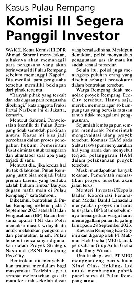 | Judul | Kasus Pulau Rempang Komisi III Segera Panggil Investor |