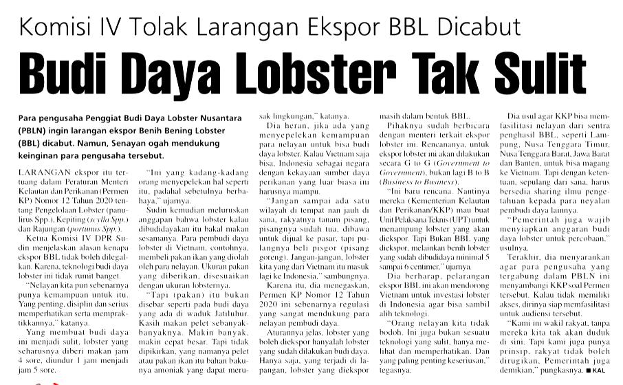 | Judul | Komisi IV Tolak Larangan Ekspor BBL Dicabut : Budidaya Lobster Tak Sulit |