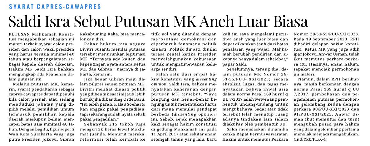 | Judul | Saldi Isra sebut putusan MK aneh luar biasa |