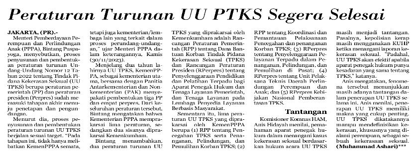 | Judul | Peraturan turunan UU PTKS segera selesai |