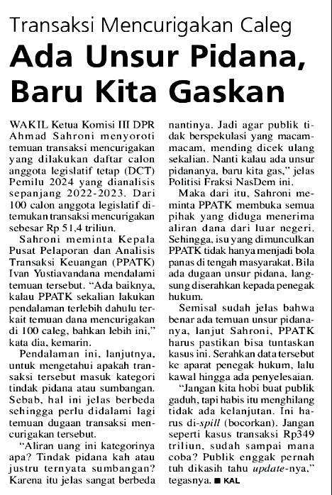 | Judul | Ada Unsur Pidana, Baru Kita Gaskan : Transaksi Mencurigakan Caleg |