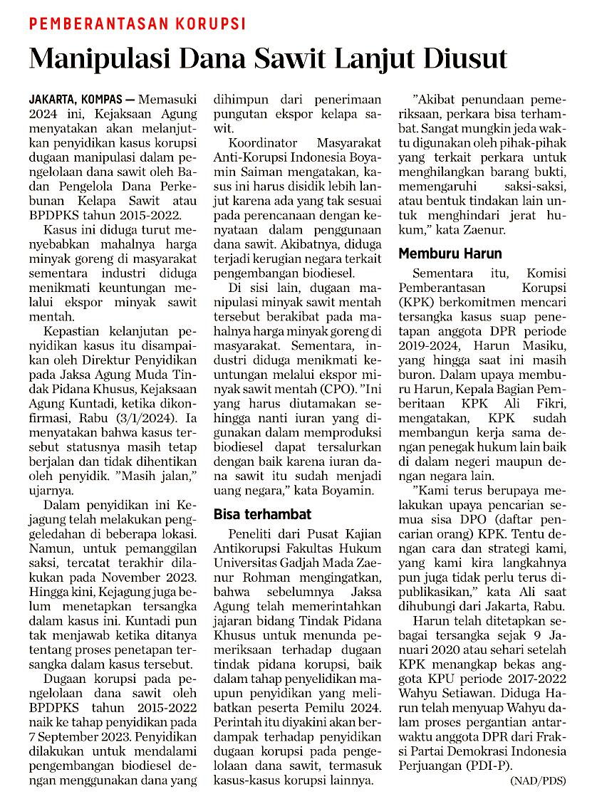 Pemberantasan Korupsi : Manipulasi Dana Sawit Lanjut Diusut