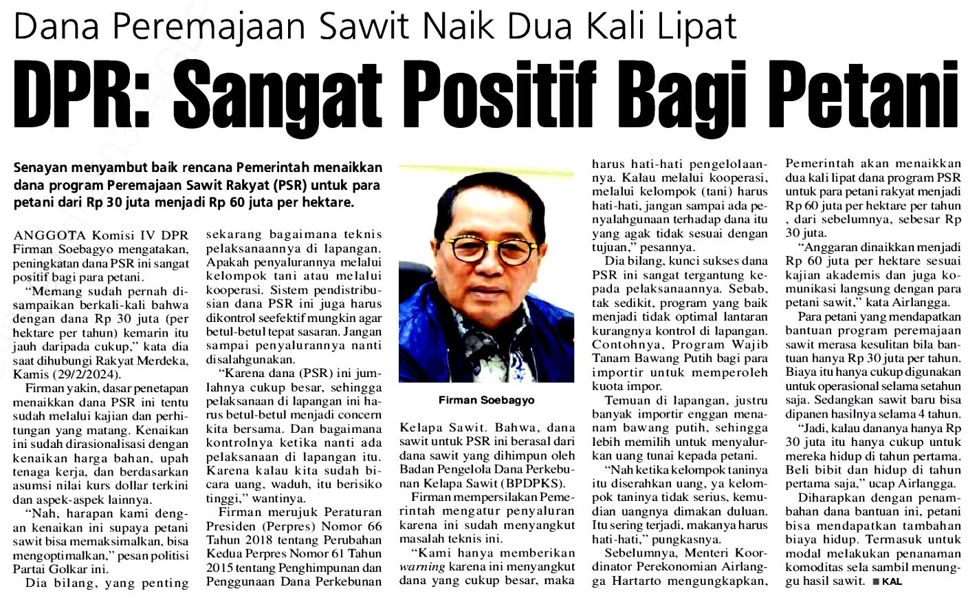 | Judul | Dana Peremajaan Sawit Naik Dua Kali Lipat - DPR : Sangat Positif Bagi Petani |