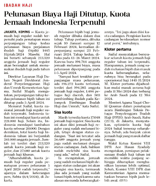 | Judul | Pelunasan Biaya Haji Ditutup, Kuota Jemaah Indonesia Terpenuhi |