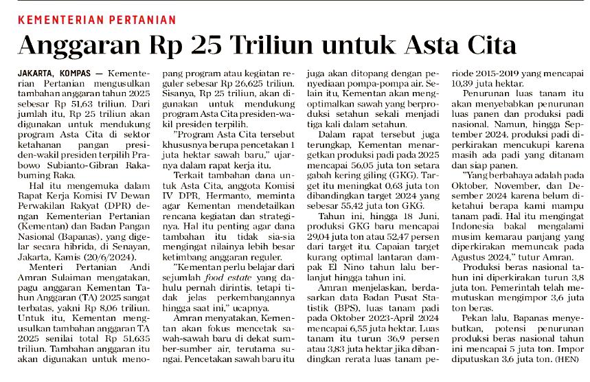Asta Cita ; Kementerian Pertanian, Anggaran - Tahun 2025 ; Hermanto