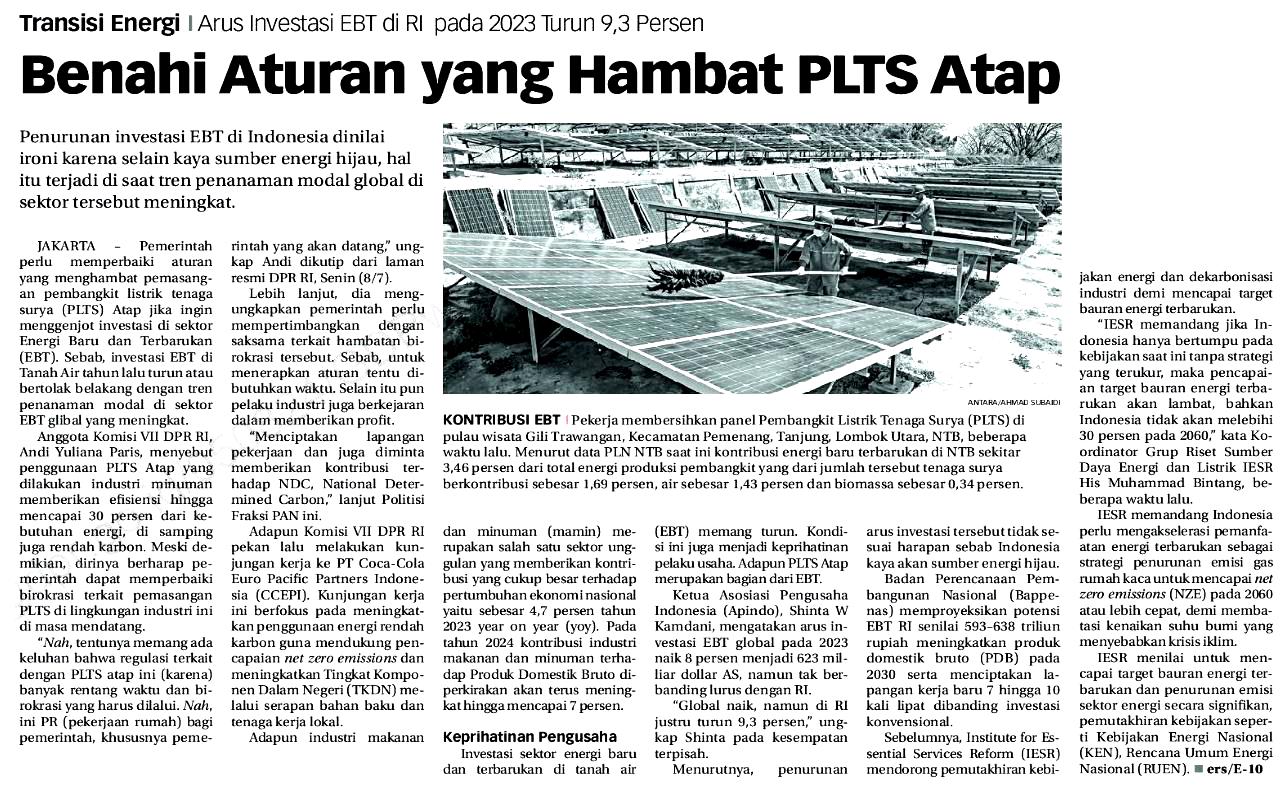 | Judul | Transisi Energi - Arus Investasi EBT di RI pada 2023 Turun 9,3 Persen - Benahi Aturan yang Hambat PLTS Atap |