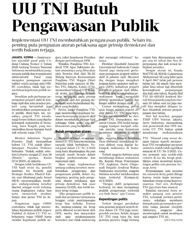 | Kata Kunci | pengawasan,publik,transparansi,administratif,politik,usia,pensiun,sipil,Prasetyo Hadi,Khairul Fahmi,HAM,Hak Asasi Manusia,Agus Subiyanto,Usman Hamid,Babinsa,Wahyu Yudhayana,Muhammad Ali |