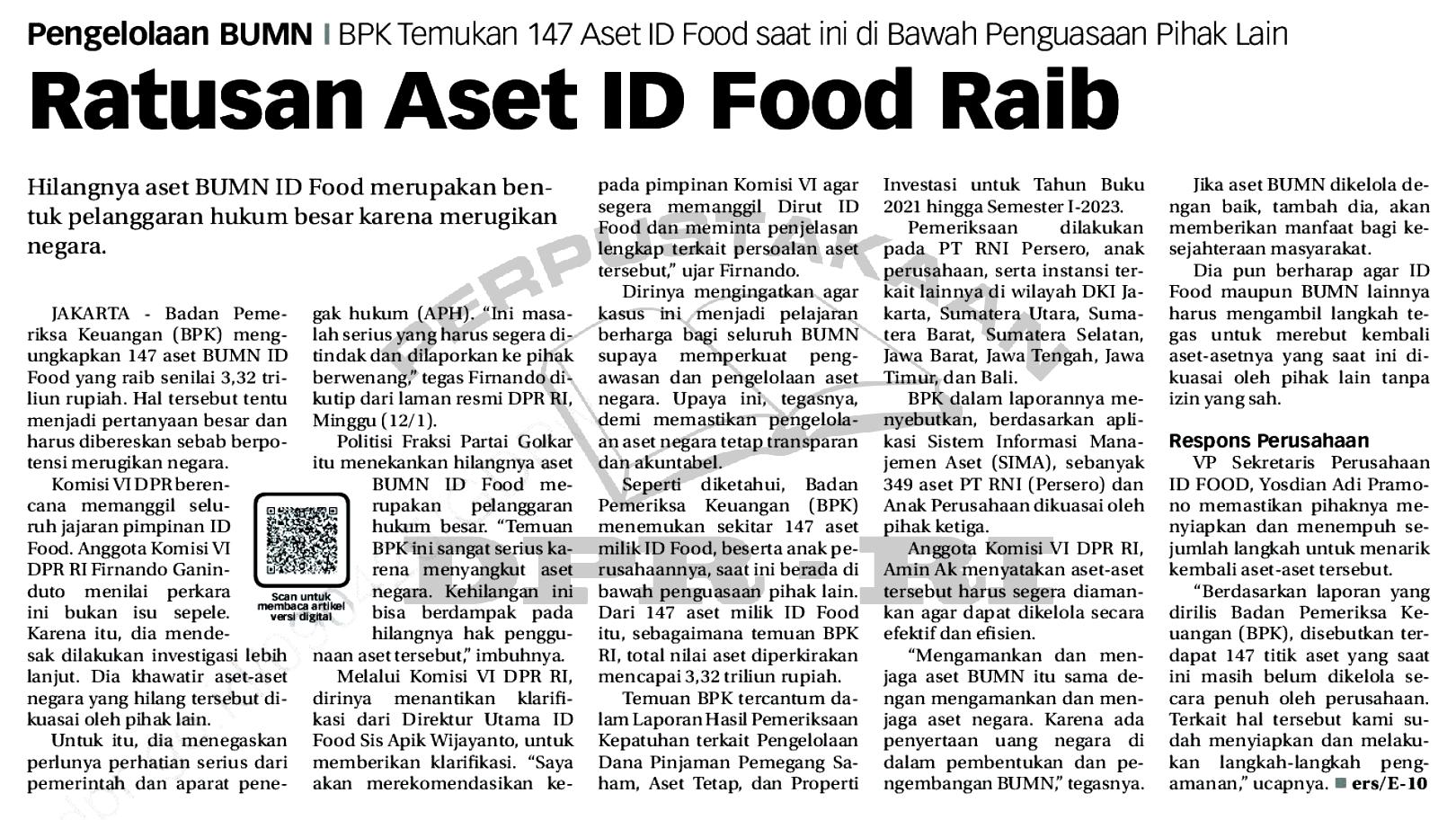 | Judul | Pengelolaan BUMN - BPK Temukan 147 Aset ID Food saat ini di Bawah Penguasaan Pihak Lain : Ratusan Aset ID Food Raib |