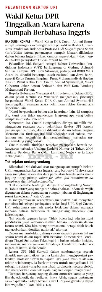 | Judul | Pelantikan Rektor UPI: Wakil Ketua DPR tinggalkan acara karena sumpah berbahasa Inggris |