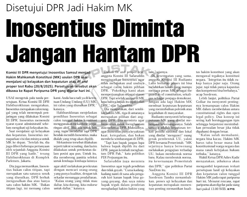| Judul | Disetujui DPR jadi Hakim MK, Inosentius diminta jangan hantam DPR |