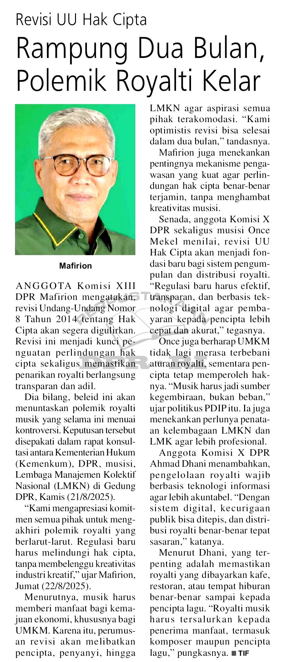 | Judul | Revisi UU Hak Cipta Rampung Dua Bulan, Polemik Royalti Kelar |