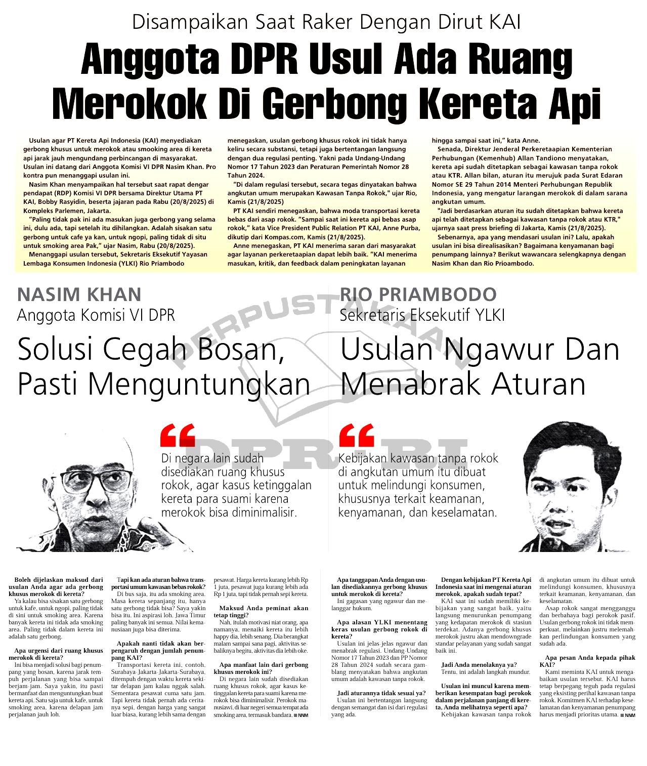| Judul | Disampaikan saat raker dengan dirut KAI,Anggota DPR usul ada ruang merokok di gerbong kereta api |