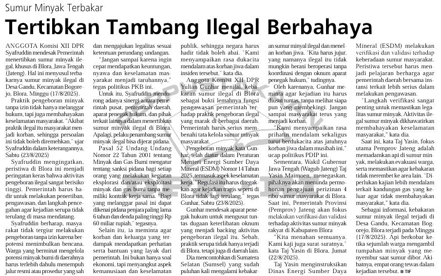 | Judul | Sumur minyak terbakar, tertibkan tambang ilegal berbahaya |