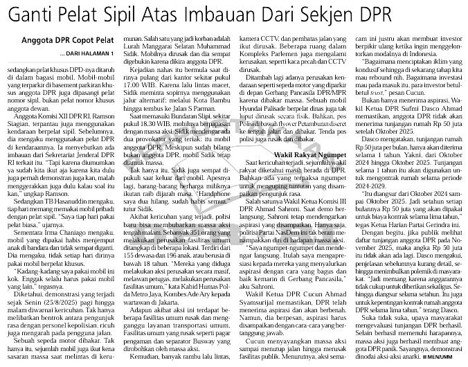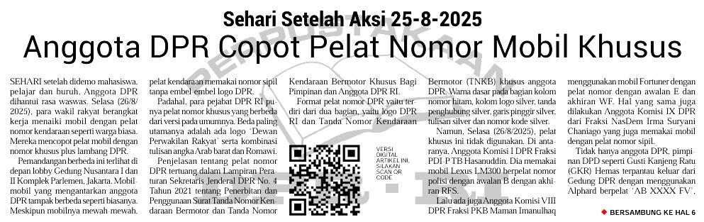 | Judul | Sehari setelah aksi 25-8-2025, Anggota DPR copot pelat nomor mobil khusus |