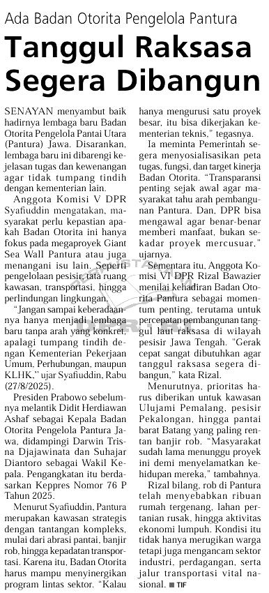 | Judul | Ada badan otorita pengelola pantura, tanggul raksasa segera dibangun |