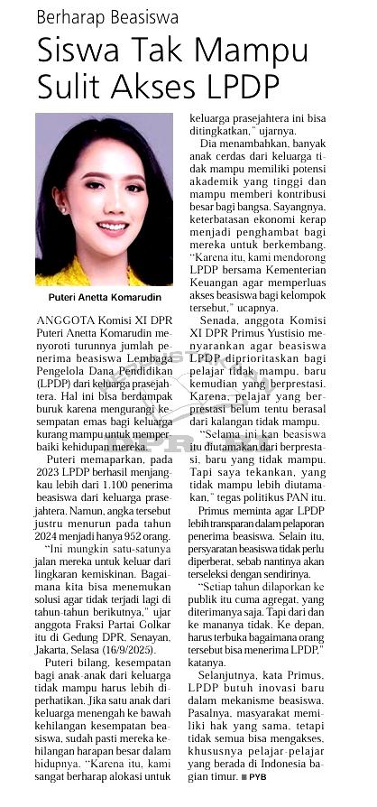 | Kata Kunci | Puteri Anetta Komarudin,Lembaga Pengelola Dana Pendidikan,Primus Yustisio,pelajar,transparan,mekanisme |