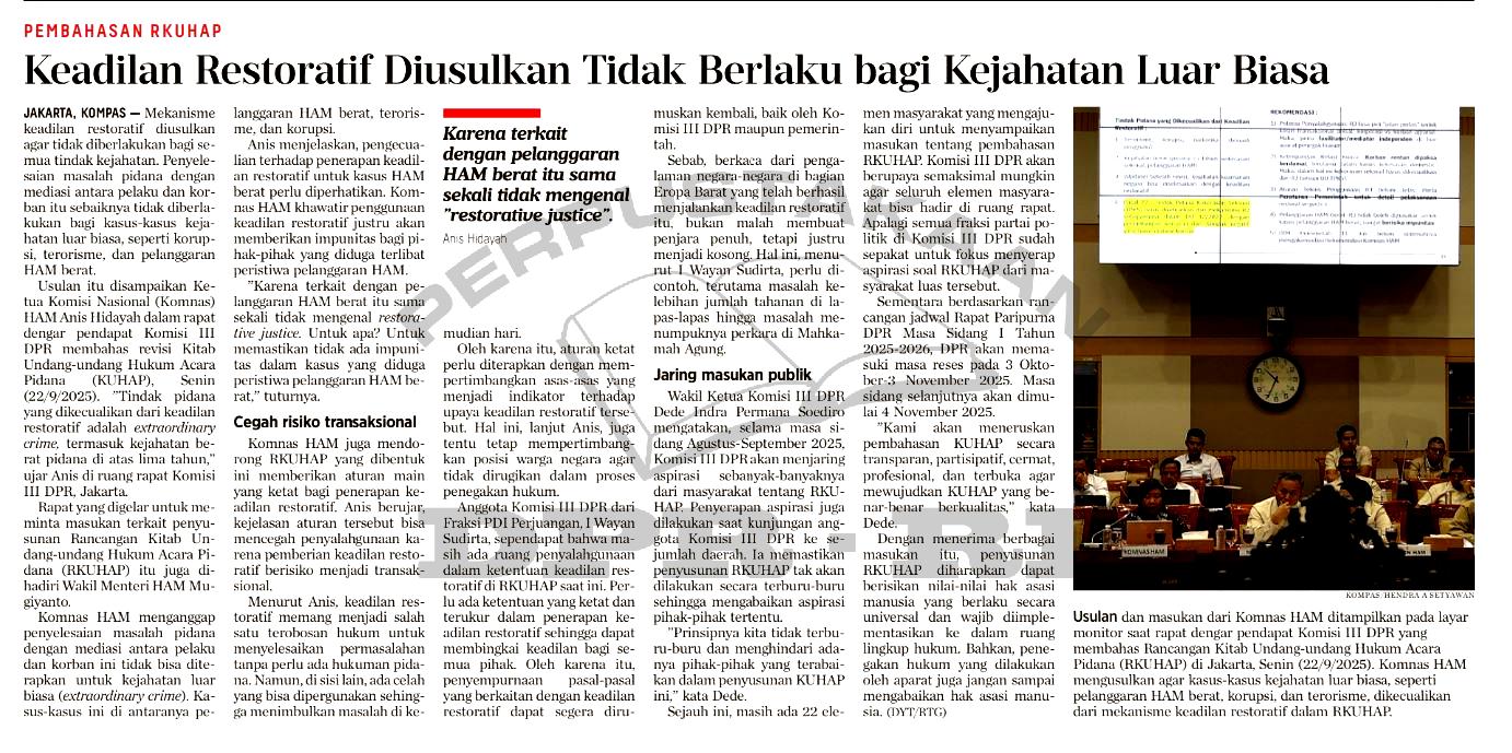| Judul | Keadilan Restoratif Diusulkan Tidak Berlaku bagi Kejahatan Luar Biasa |