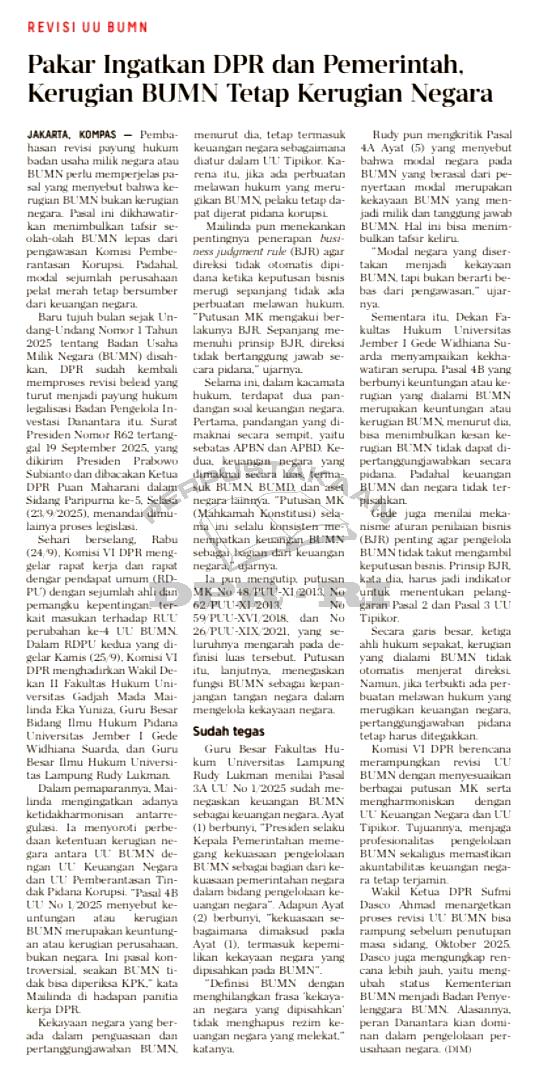 | Judul | Pakar Ingatkan DPR dan Pemerintah, Kerugian BUMN Tetap Kerugian Negara |
