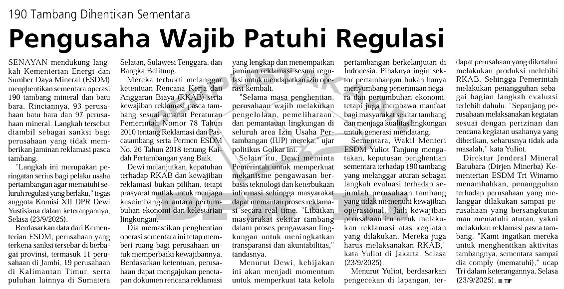 | Judul | 190 Tambang dihentikan sementara, pengusaha wajib patuhi regulasi |