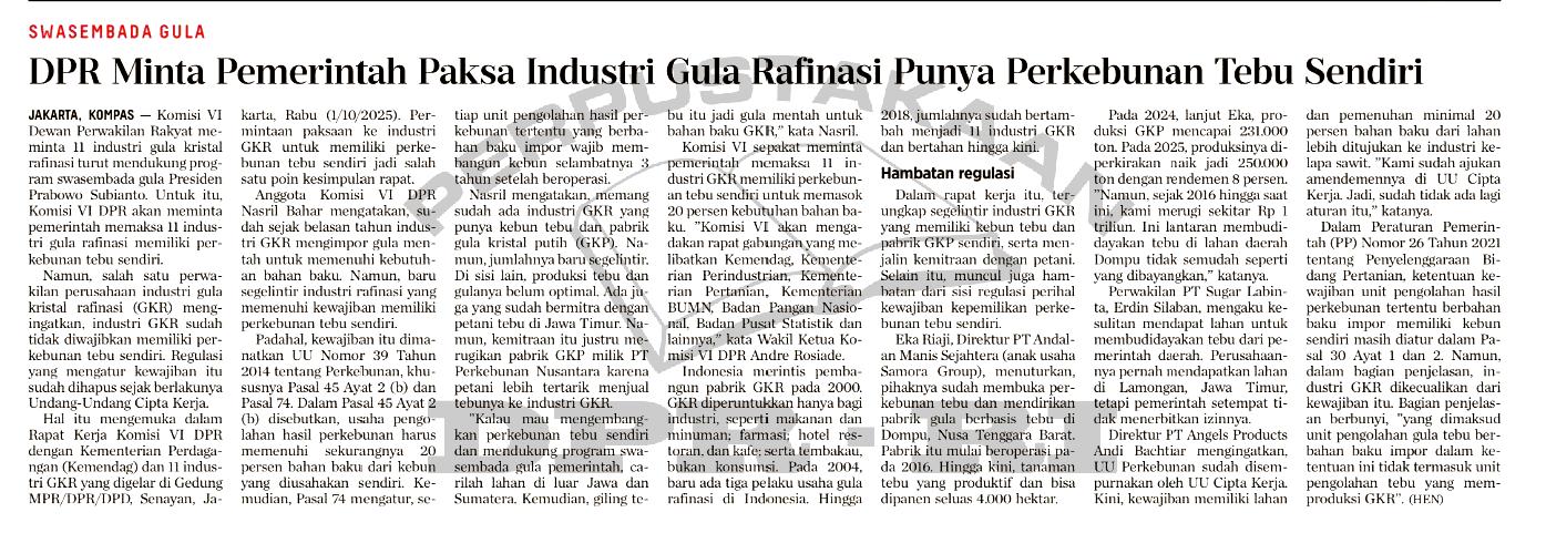 | Judul | DPR Minta Pemerintah Paksa Industri Gula Rafinasi Punya Perkebunan Tebu Sendiri |