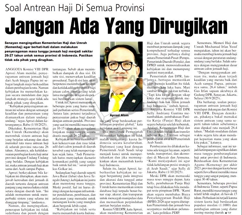 Soal Antrean Haji di Semua Propinsi Jangan ada yang Dirugikan